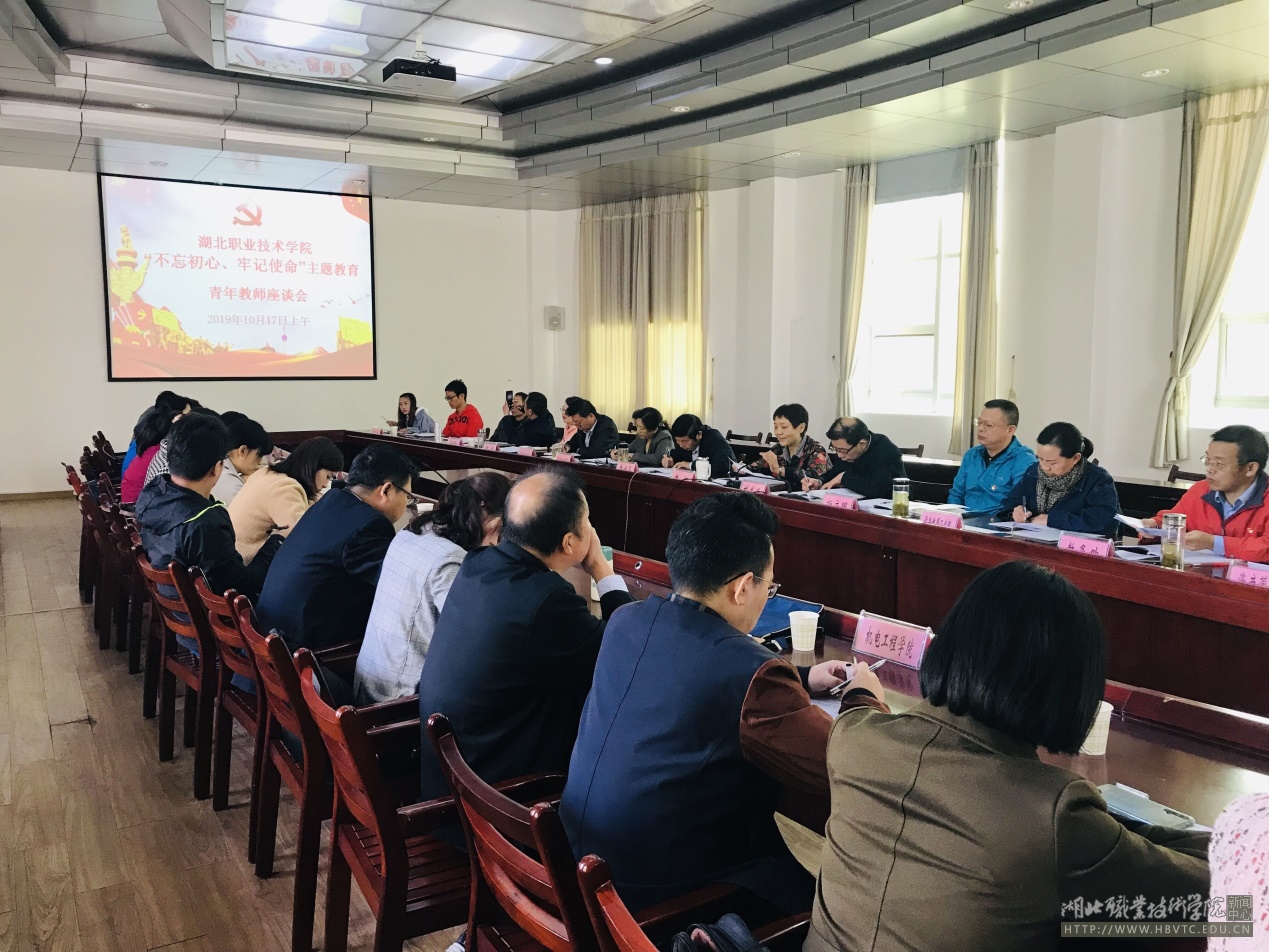 为深入贯彻落实中央、省、市“不忘初心、牢记使命”主题教育工作会议精神,根据《关于在全校开展“不忘初心、牢记使命”主题教育工作方案》(鄂职院党发[2019]23号)安排部署,10月17日,学校青年教师座谈会在文德楼二楼会议室召开。学校党委书记张国雄、校长朱虹等全体党委领导班子成员出席会议,来自学校各教学单位的38名青年教师代表,党委组织部、党委教师工作部、党委学工部、团委、工会办公室、教务处、后勤保障处、资产管理处及15个教学单位主要负责人参加会议。座谈会分上午和下午两个时段召开,上午的座谈会由校长朱虹主持,下午的座谈会由学校党委委员、纪委书记高英雄主持。