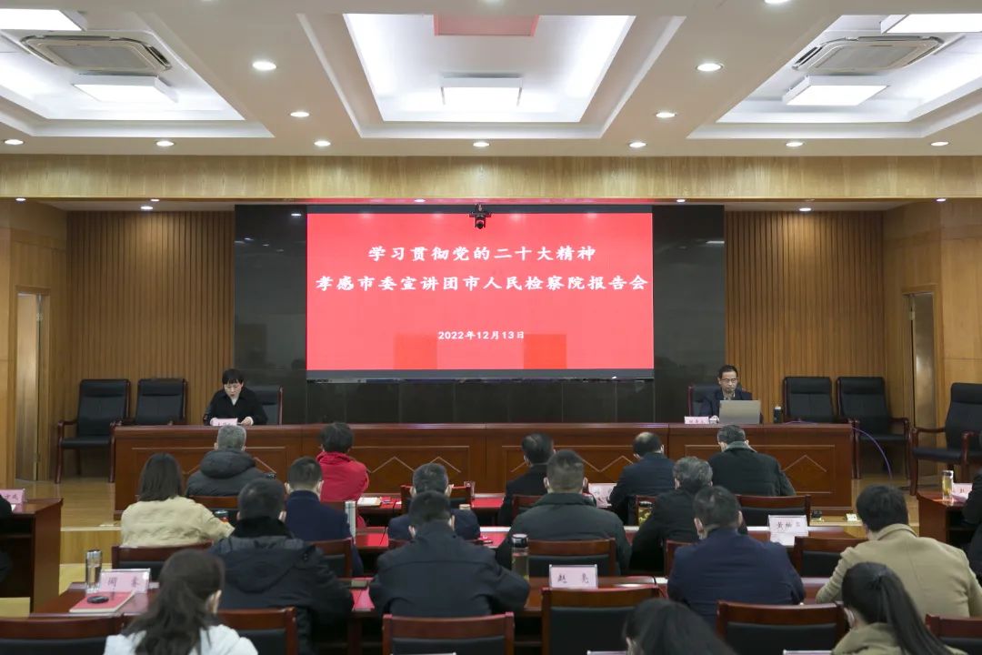 (本网讯 陈灏)12月13日,学习贯彻党的二十大精神市委宣讲团到孝感市检察院宣讲党的二十大精神,市委宣讲团成员,我校田寿永教授作宣讲报告,该院党组书记、检察长匡茂华出席报告会,该院党组副书记、副检察长叶蕾主持报告会,市检察院全体院领导、县级干部、检察干警参加报告会。