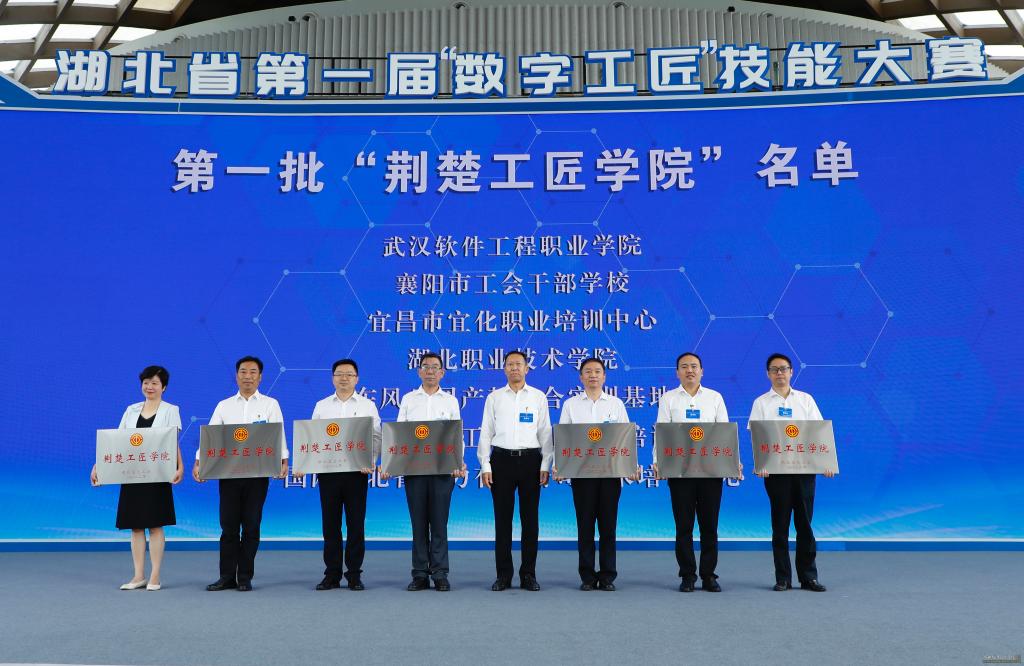 (本网讯 通讯员 朱晓艳) 建设先行区,奋进新征程。 9月22日上午,由湖北省总工会主办的2022年湖北省第一届“数字工匠”职工技能大赛开幕式在国家网络安全人才与创新基地展示中心举行,在开幕式上,湖北职业技术学院等七家单位被命名为湖北省首批荆楚工匠学院。省人大常委会副主任、省总工会主席刘雪荣为七家单位授“荆楚工匠学院”匾牌,学校党委副书记、工会主席刘发兴同志代表学校参加开幕式并上台领取匾牌。