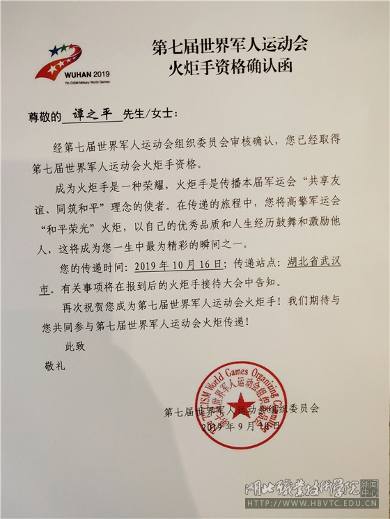 10月16日上午,第七届世界军运会“和平荣光”火炬将在武汉传递,武汉段火炬传递从东湖绿道梨园入口开始,到楚城为止,全程7公里。100名火炬手将参与传递,由军队火炬手、地方火炬手、外籍火炬手等组成,我校团委书记谭之平有幸成为此届运动会的火炬手。